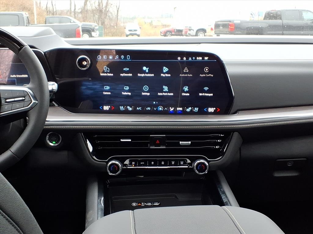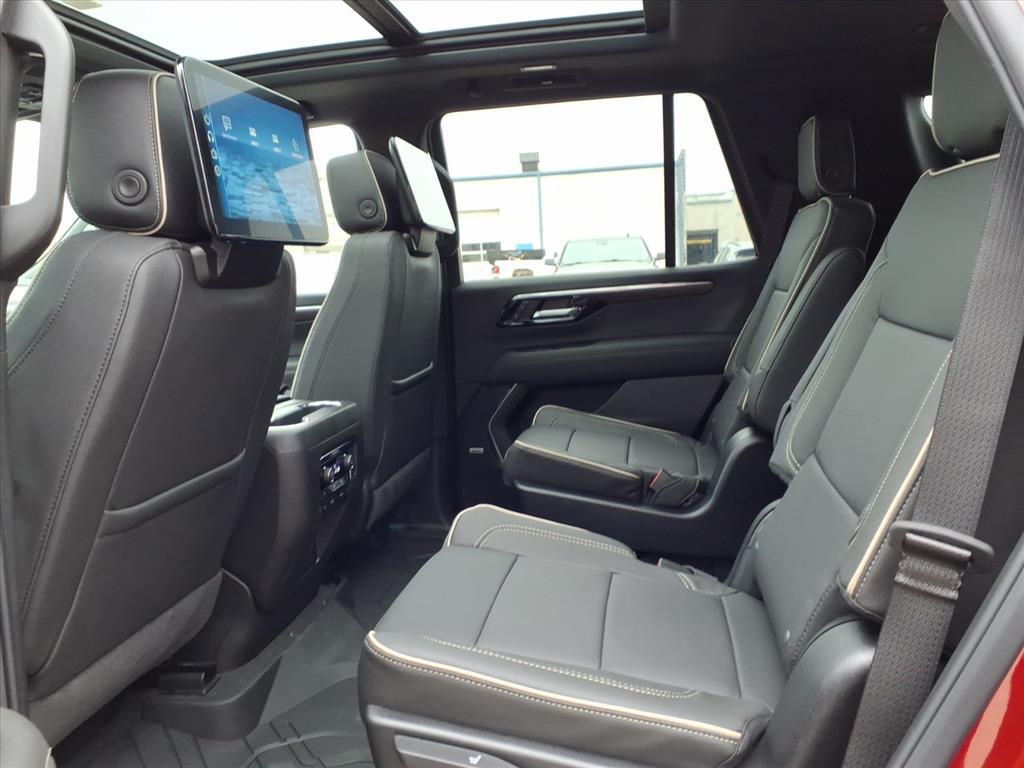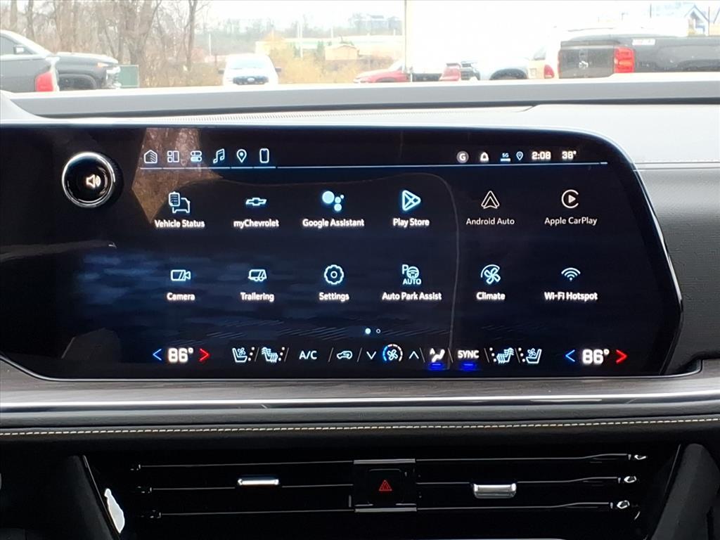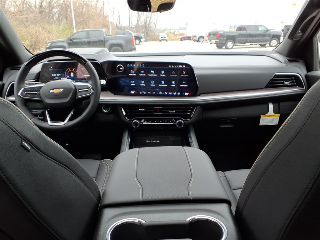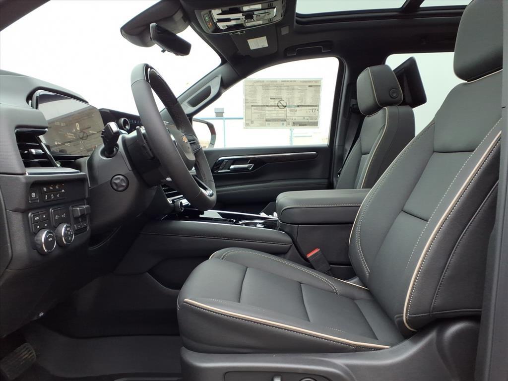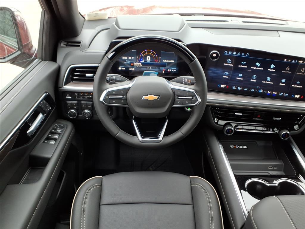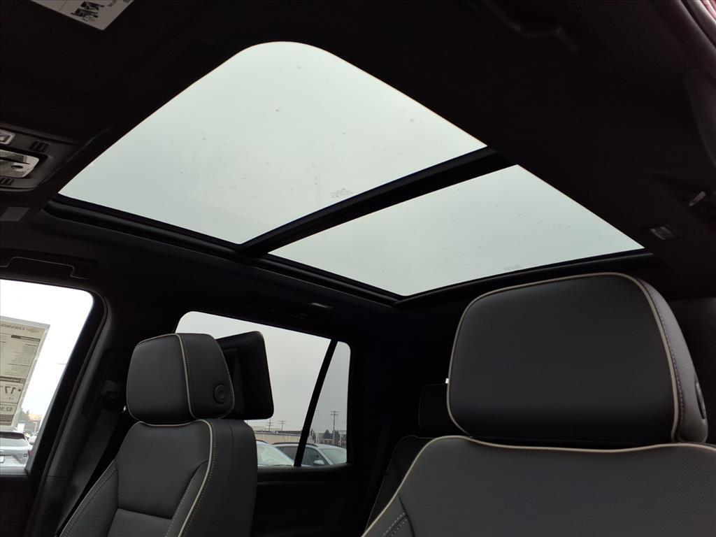 Demo/CTP units may have more mileage than a normal new retail unit. Advanced Security Package (Glass Breakage Sensor, Theft-Deterrent Alarm System, Vehicle Inclination Sensor, and Vehicle Interior Movement Sensor), Advanced Trailering Package (Blind Zone Steering Assist with Trailering, Hitch View with Pan/Zoom Image Adjustment, and Smart Trailer Integration Indicator), Max Trailering Package (2-Speed Active Electronic AutoTrac Transfer Case, Hill Descent Control, and Integrated Trailer Brake Controller), Premium Liner Protection Package (3rd Row All-Weather Floor Liners, All-Weather Cargo Mat, and First and Second Rows Premium Floor Liners), Technology & Entertainment Package (Dual-Pane Power Panoramic Sunroof and Rear Seat Media System), Technology Package (15Diagonal Multi-Color Head-Up Display, AutoSense Hands-Free Power Liftgate, and Inside Rearview Auo-Dimming Rear Camera Mirror), 4WD, Jet Black Leather, 10 Speakers, 1st and 2nd Row Color-Keyed Carpeted Floor Mats, 20x 9Polished Aluminum Wheels, 3-Spoke Wrapped Steering Wheel, 3.23 Rear Axle Ratio, 3rd Row 60/40 Power-Folding Split-Bench Seat, 3rd row seats: split-bench, 4-Way Power Driver Lumbar Seat Adjuster, 4-Way Power Front Passenger Lumbar Seat Adjuster, 4-Wheel Disc Brakes, 8-Way Power Driver Seat Adjuster, 8-Way Power Front Passenger Seat Adjuster, ABS brakes, Adaptive suspension, Air Conditioning, Alloy wheels, AM/FM radio: SiriusXM with 360L, Apple CarPlay/Android Auto, Auto High-beam Headlights, Auto-dimming door mirrors, Auto-Dimming Inside Rear-View Mirror, Auto-dimming Rear-View mirror, Auto-leveling suspension, Automatic temperature control, Bose 10-Speaker Centerpoint Surround Audio System Feature, Brake assist, Bright Front and Rear Door Sill Plates, Bumpers: body-color, Chrome Door Handles with Body-Color Strip, Chrome Mirror Caps, Color-Keyed Carpeting Floor Covering, Compass, Delay-off headlights, Driver and Front Passenger Heated and Ventilated Seats, Driver door bin, Driver vanity mirror, Dual Exhaust System, Dual front impact airbags, Dual front side impact airbags, Electronic Stability Control, Emergency communication system: OnStar and Chevrolet connected services capable, Exterior Parking Camera Rear, Floor Console, Four wheel independent suspension, Front anti-roll bar, Front Bucket Seats, Front Center Armrest, Front dual zone A/C, Front fog lights, Front LED Fog Lamps, Front reading lights, Frontal Driver and Outboard Passenger Airbags, Fully automatic headlights, Ga