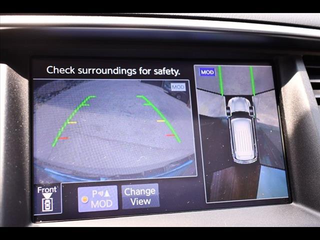 automatic LED headlamps with high beam assist, front LED fog lights, navigation system, Bluetooth hands-free phone system, Around View monitor with front/rear sonar system and moving object detection, rain-sensing variable intermittent windshield wipers, automatic power door locks, remote keyless entry, HomeLink universal transceiver, Infiniti Intelligent Key with illuminated push button ignition, tire pressure monitoring system with individual tire display and full-size spare tire.